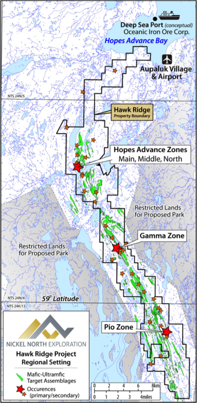 - Hawk Ridge covers 173 km2 over a 50 km belt of Ni-Cu-PGE occurrences on tidewater in Quebec.